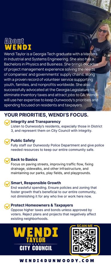 Wendi would love your help. Whether it’s knocking on doors, talking with neighbors, making phone calls, sending texts, or even hosting a meet and greet, there’s a place for you on this team. By signing up here, Wendi will reach out and partner with you so you can work together to keep Dunwoody a great place to live, work, and raise a family.